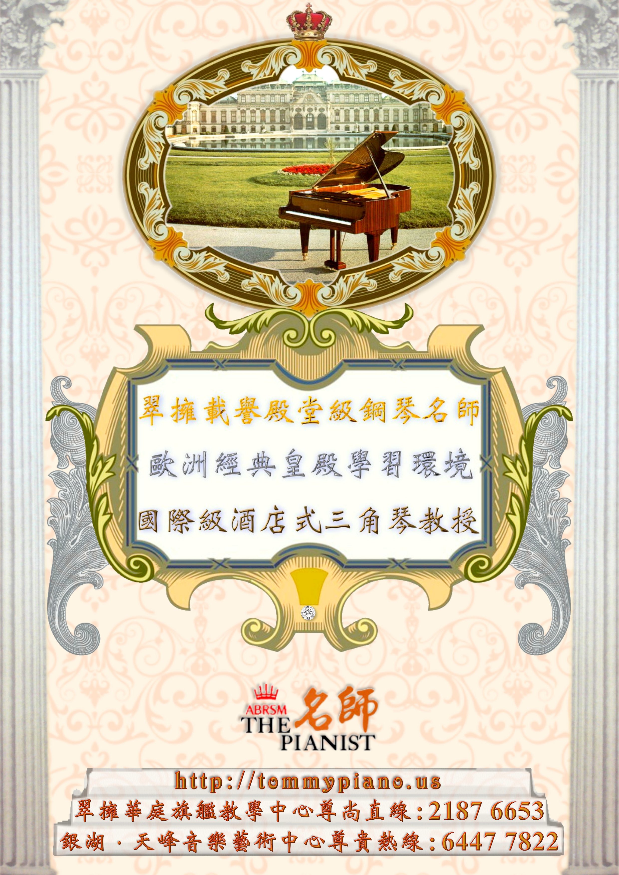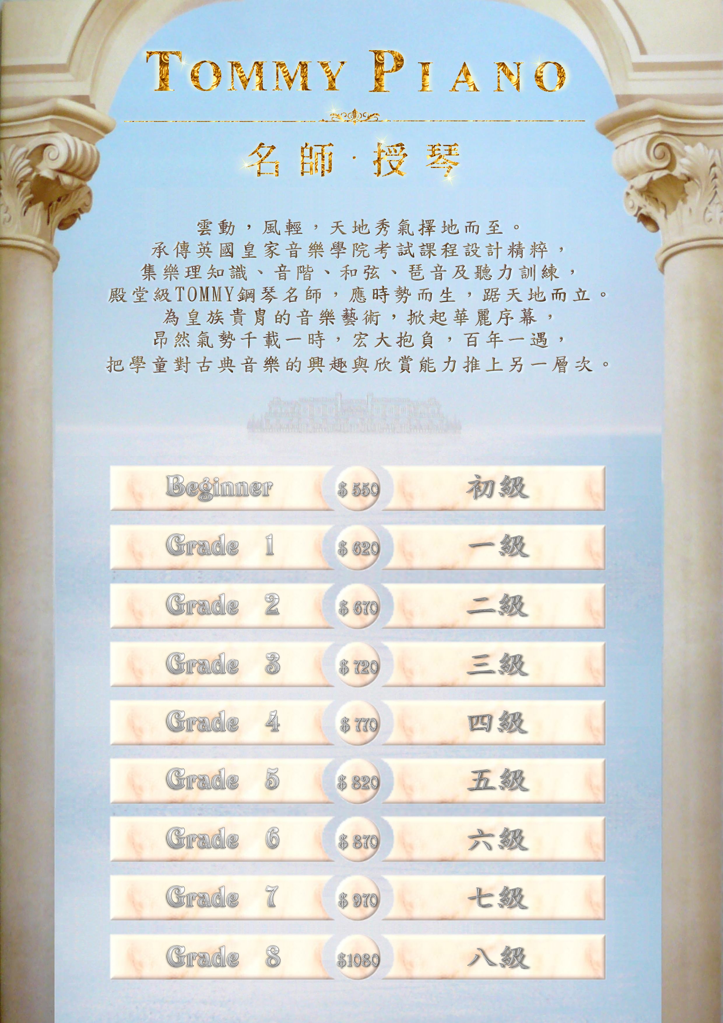 TOMMY PIANO 課程根據英國皇家音樂學院考試範圍設計,殿堂級鋼琴名師除了教授基本樂理知識、五線譜視奏、音階、和弦、琶音及聽力訓練外,更專注教授樂章演奏的基本概念技巧。由淺入深教授學童掌握和弦、旋律及拍子等彈奏技巧,同時會對左右兩手配合彈奏進行重點鍛練,培養學童對古典音樂的興趣與欣賞能力 及保送參加英國皇家音樂學院各級鋼琴考試。